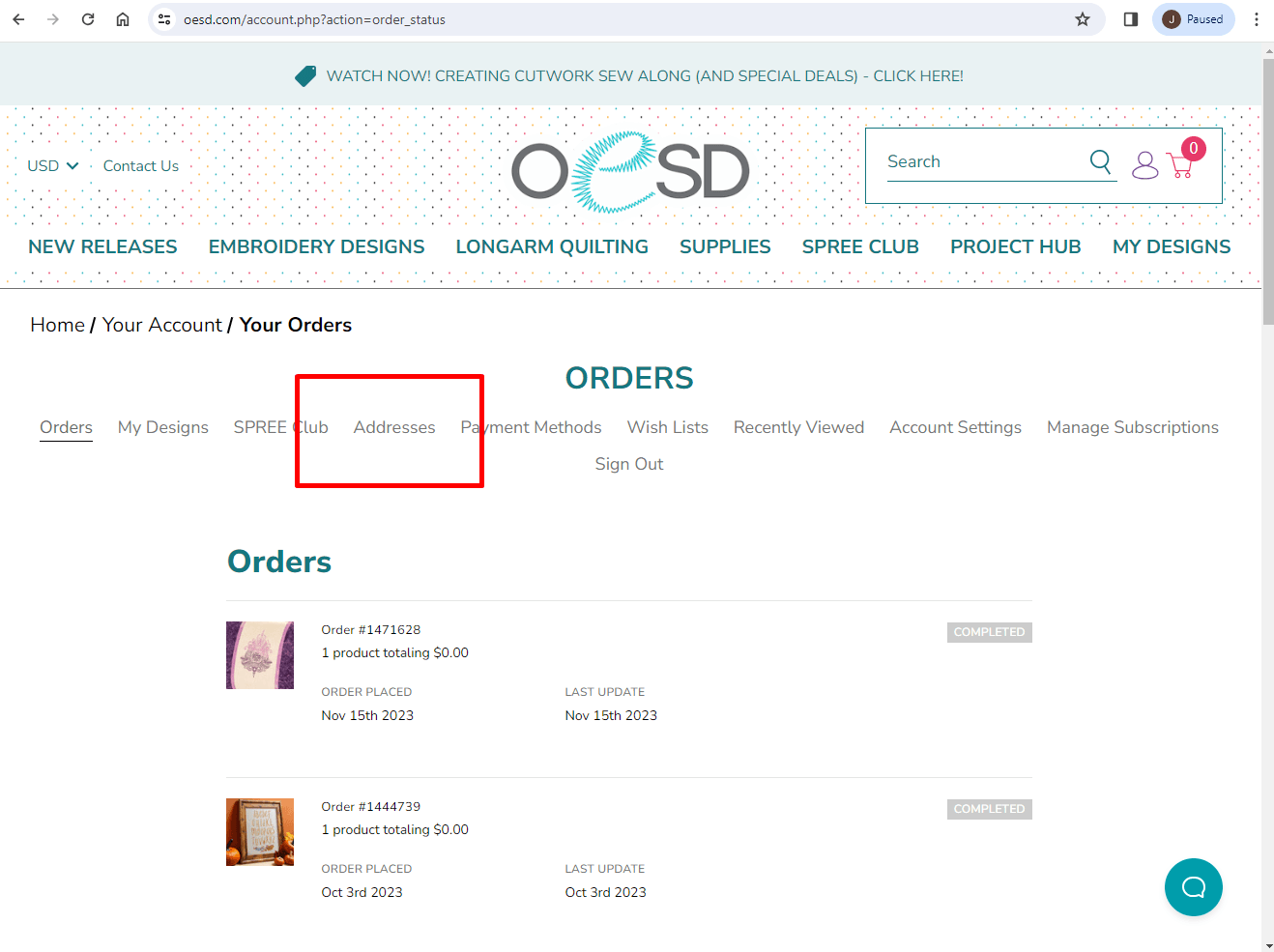 Once you are on your Account Pages, select the Addresses Tab.