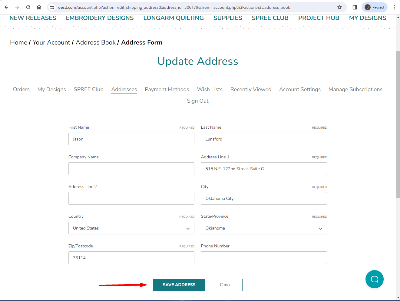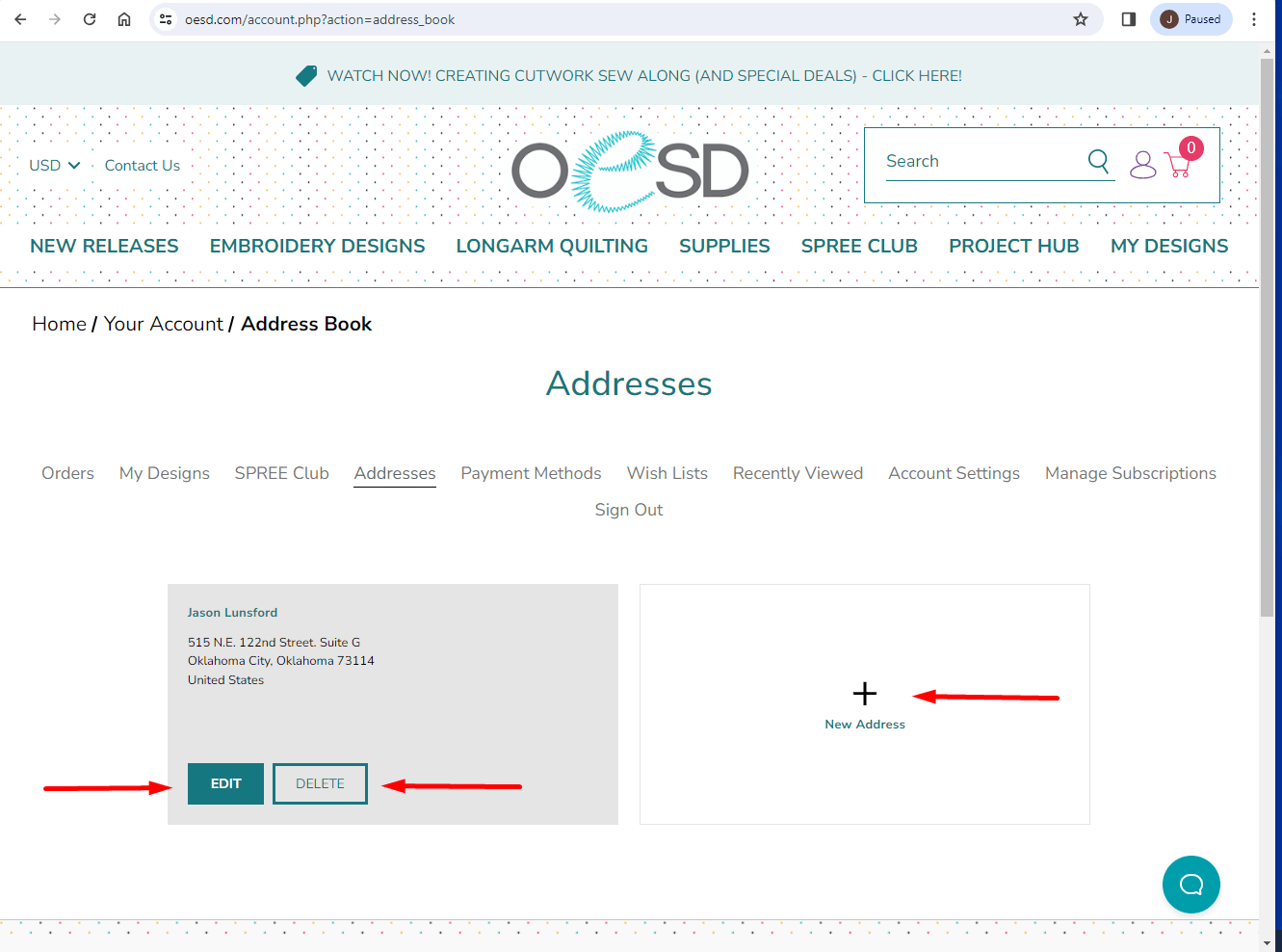 You can now add, delete, or update your address. To Edit your address, click on the "Edit" button.